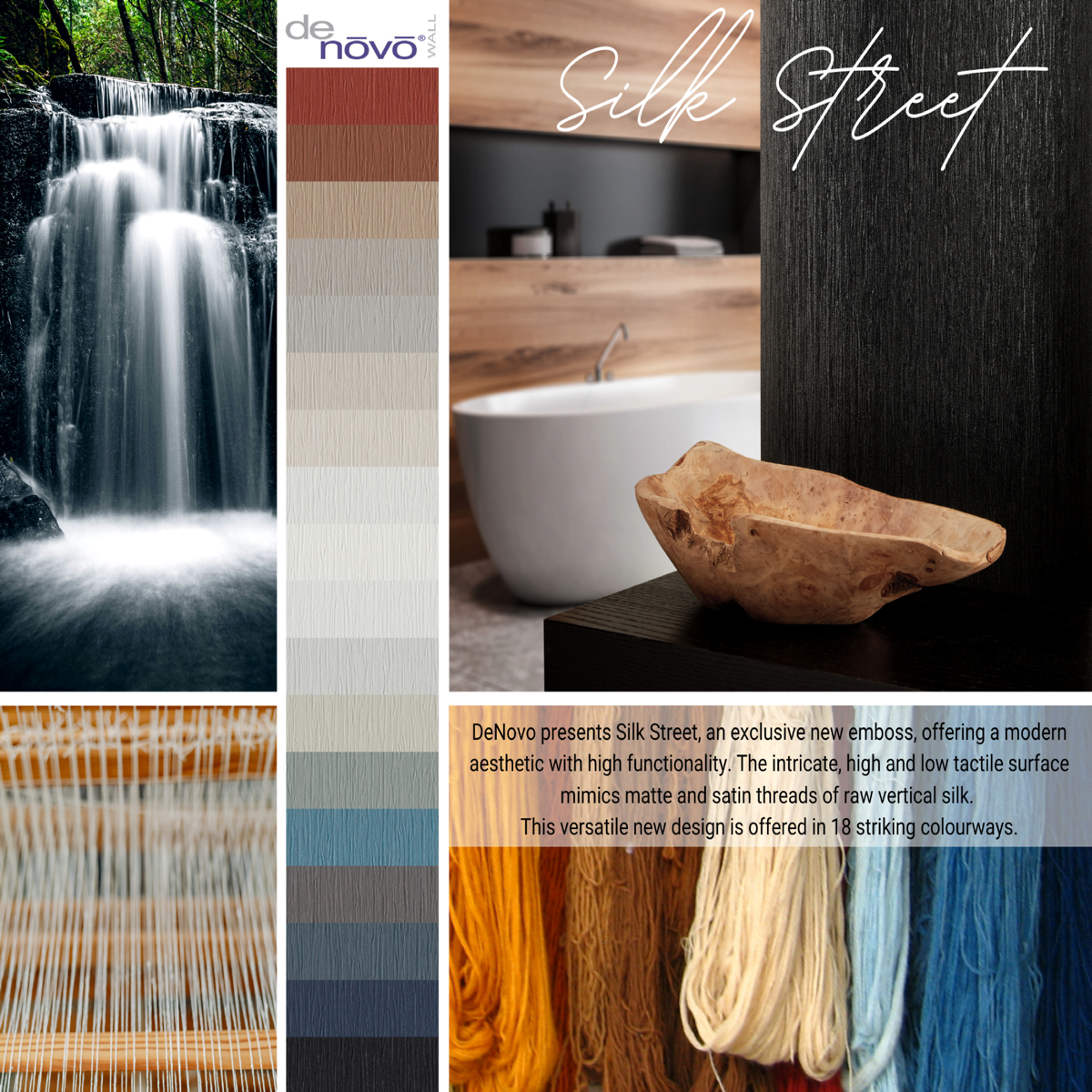 DeNovo presents Silk Street, an exclusive emboss, offering a modern aesthetic with high functionality. The intricate, high and low tactile surface mimics matte and satin threads of raw vertical silk. This versatile new design is offered in 18 striking colorways.