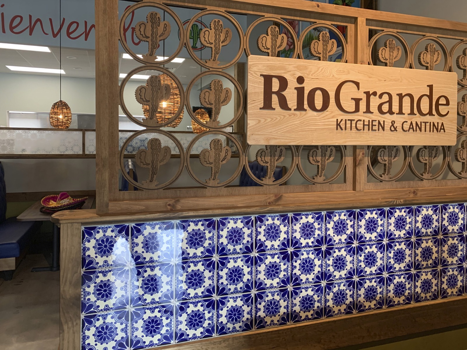 The design team for Rio Grande wanted to bring authentic Mexican style to their new location. Pepe Silva came to ATI with a few ceramic tiles that he had bought on a trip to Mexico as inspiration. They planned to use the tile motif on the wall behind the bar and needed to create a wall panel that was easy to clean, abrasion resistant and beautiful. Although Pepe chose a ceramic tile, it created several challenges related to transportation and breakage, as well as its cleanability, specifically in the grout lines. They also needed decorative divider panels to add more style to their booth seating area. In addition, Pepe asked for a mural that would showcase a map of Mexico, highlighting where Pepe and his family are from. All of these challenges needed to incorporate the history and style of the Rio Grande flagship location.