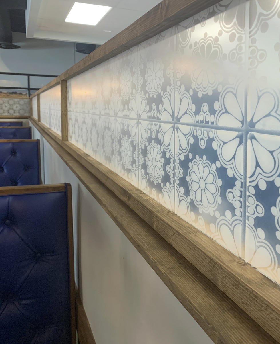 From that blue and white tile, our design team at ATI duplicated the pattern on a clear, acrylic substrate that provided privacy between the dining room and the bustling noise of the kitchen. These pieces had the same pattern as the original tile, but are frosted with the design.